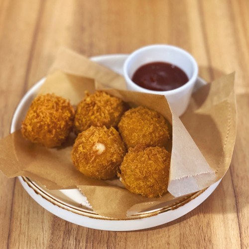 Descripción de la foto para personas con discapacidad visual: Bolas de mozzarella fritas dentro de un recipiente de madera. (Crédito: OxanaDenezhkina | Envato Elements)