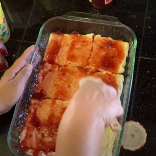 - Repetir este procedimiento de colocar una capa de rodajas de pan sándwich y una capa de jalea, hasta que se llene el molde de vidrio. La última capa debe ser solo de pan.