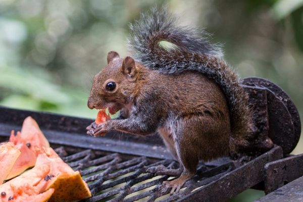 Descripción de la foto para personas con discapacidad visual: ardilla tropical comiendo melón en una reja metálica. (Crédito de foto: iNaturalist)