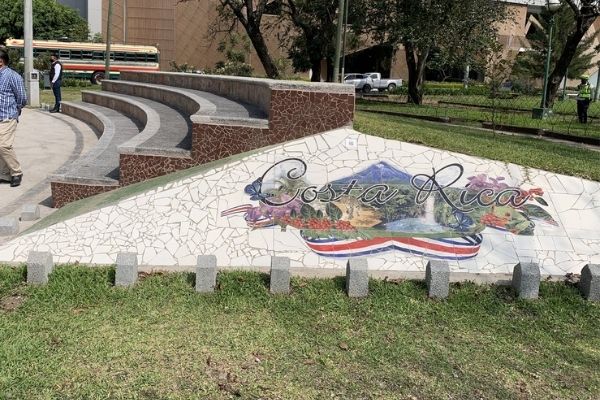 Descripción de la foto para personas con discapacidad visual: La Plaza Costa Rica con las modificaciones actuales del graderío y el mosaico. (Crédito de foto: Embajada de Costa Rica)
