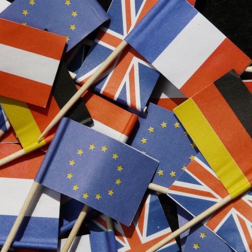Descripción de la foto para personas con discapacidad visual: Banderas de papel de: La Unión Europea, Alemania y Francia. (Créditos: Canva).