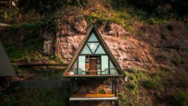 La cabaña A-Frame Madera es un hospedaje enclavado en las montañas de San Marcos La Laguna con vistas increíbles y una arquitectura moderna.