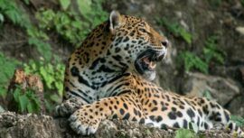 Turistas captan a un jaguar y su cachorro, los felinos más grandes de América, cruzando una carretera hacia el Parque Nacional Tikal en Petén.