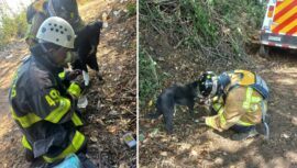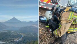 Bomberos Voluntarios rescataron a un perrito en el volcán de Agua mientras se encontraban trabajando para sofocar el incendio forestal.