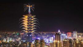 Transmisión en vivo de la celebración de Año Nuevo desde el Edificio Taipei 101, en República China (Taiwán) que incluye música y pirotecnia.