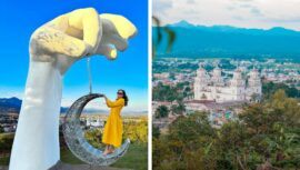 El nuevo mirador temático en el Parque Ecológico Cueva de las Minas se trata de una mano gigante con una luna colgante con vista a la Basílica.