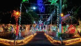 Las decoraciones navideñas en el parque de Flores Costa Cuca cuentan con hermosos adornos navideños para celebrar la época en Guatemala.