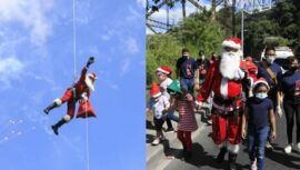 El Oficial Mayor Chacón, disfrazado de Santa Claus, descendió del puente Las Vacas para entregar juguetes a los niños que viven en los asentamientos.