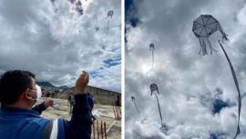 Miembros del Festival de Sumpango volaron barriletes blancos en la celebración de la actividad como un homenaje a víctimas fallecidas de Covid-19.