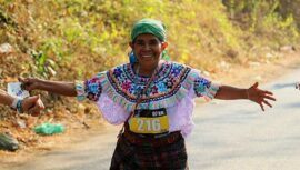 La guatemalteca Maria Vargas Sente, corrió con su traje típico en la Ultra Trail Atiquizaya Pathfinder 2023, celebrada en El Salvador.