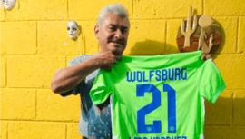 El guatemalteco Fabio “Lobo” Vásquez recibió como regalo la camiseta del equipo VfL Wolfsburg que juega en la Bundesliga del fútbol de Alemania.