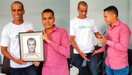 El artista Edgar Lemus, originario del departamento de Zacapa, le regaló un retrato hecho con lápiz al exfutbolista brasileño Rivaldo Ferreira.