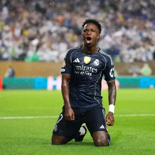 Descripción de la foto para personas con discapacidad visual: Vinicius Junior, jugador del Real Madrid, celebra un gol en el Mundial de Clubes 2025.