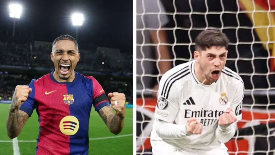 Descripción de la foto para personas con discapacidad visual: En la imagen dos jugadores celebrando. El primero es Raphina del Barcelona y el segundo Federico Valverde del Real Madrid. (Crédito: FCBarcelona / RealMadrid)