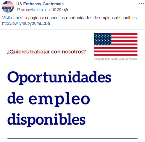Te contamos cómo los guatemaltecos pueden aplicar a la oportunidad de empleo que ofrece la Embajada de Estados Unidos en Guatemala, noviembre 2018.