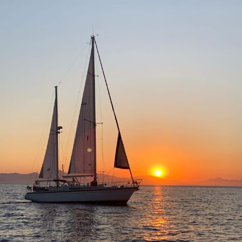 Descripción de la foto para personas con discapacidad visual. Foto 1: barco velero en el mar durante un atardecer. Foto 2: Rosamaria Castillo-Benoist en el barco velero en donde ondean la bandera de Guatemala y Franci. (Crédito: Rosamaria Castillo-Benoist)