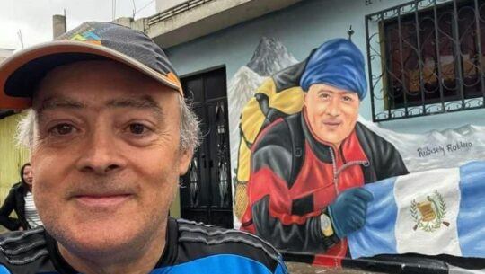 El rostro en un mural del montañista guatemalteco Jaime Viñals adorna una de las calles de San Pedro Sacatepéquez, San Marcos.