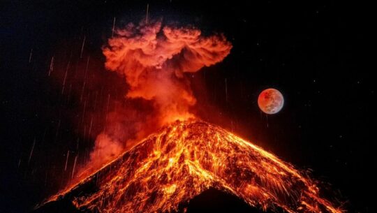 El fotógrafo guatemalteco César Santizo hizo una impresionante fotografía del eclipse total de Luna con el Volcán de Fuego